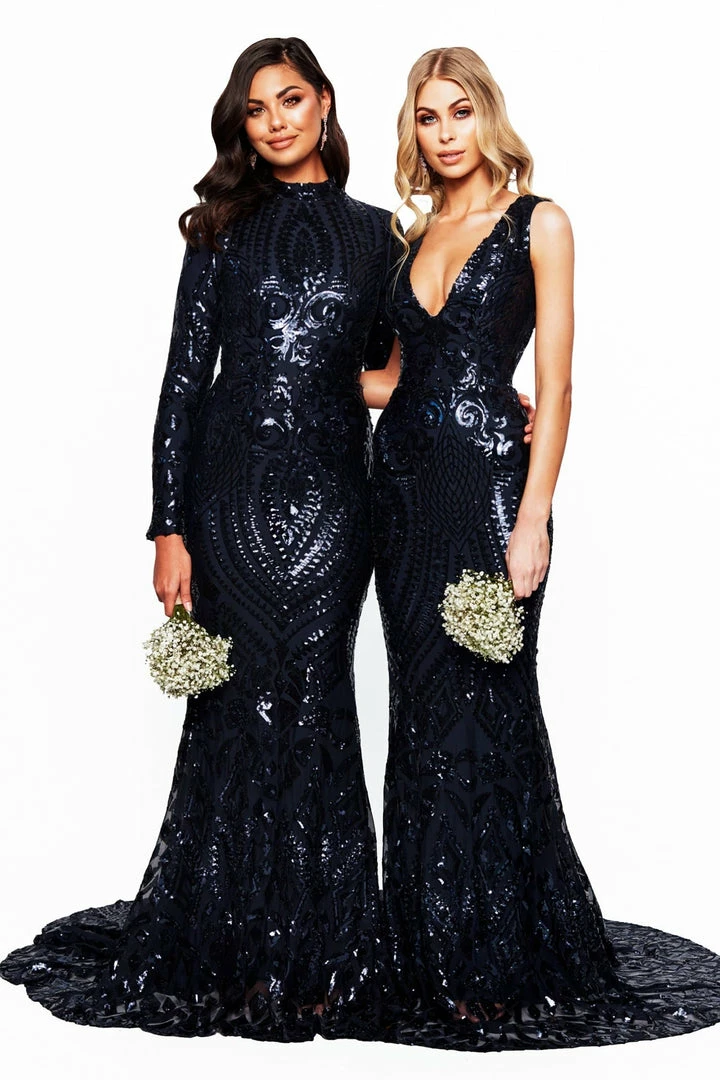 The classy Cosimia Sequin Gown features a high neckline, long sleeves and a mermaid silhouette with train. Made from our signature sparkly patterned sequins fabric which is lined & stretchy.Â