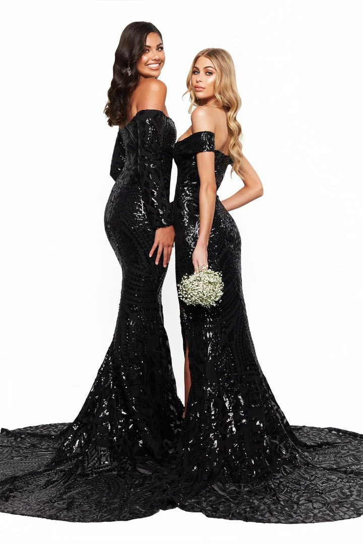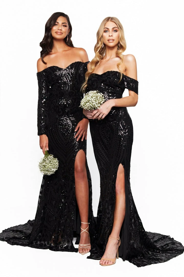 The Kora Sequin Gown (pictured right) is a stunning off-shoulder gown in black. Made from incredibly sparkly patterned sequins fabric and featuring off-shoulder sleeves with a thigh-high slit.
