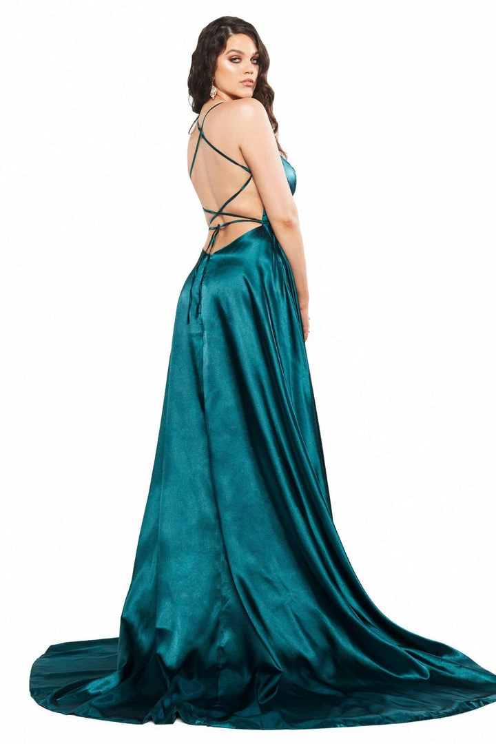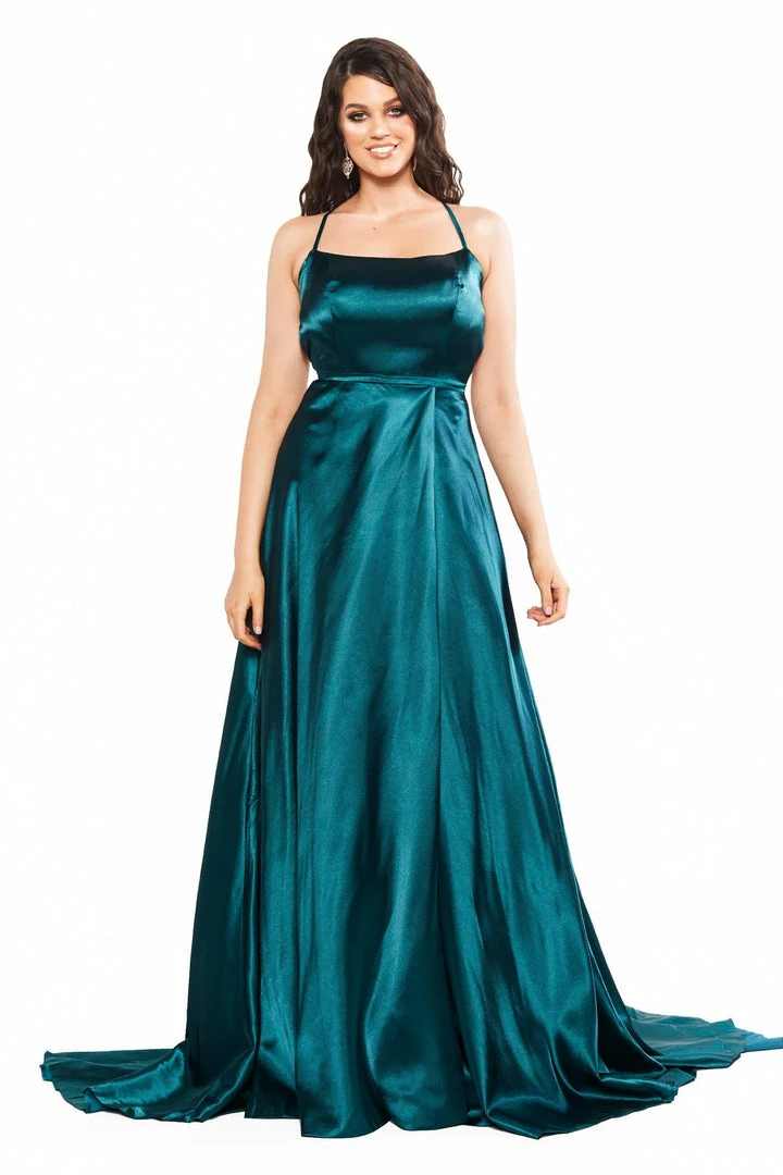 Feel luxurious in our Bianca Gown. It is made from a thick satin and is double lined to the hem. It has an A line style fit with a hidden front slit. Features on this gown include a square neck and lace up open back. The material has minimal stretch.Â