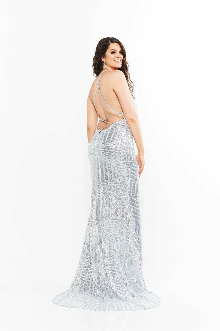 Stand out in our Cosmo Gown. The features of this dress include gorgeous silver sequin fabric with a high neckline, lace up straps and a thigh slit. This gown is fully lined and is super stretchy.Â