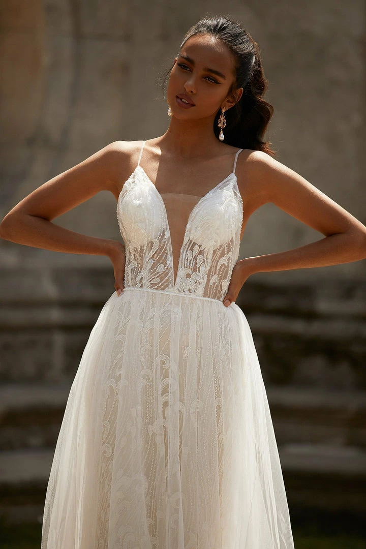 Feel like a breath of fresh air in this luxurious, effortless & delicate bridal gown. Ciana is made from lightweight dreamy tulle with sparkling beading all over. Also features a plunge neckline with mesh insert, thin straps, open back & detachable overskirt.Â