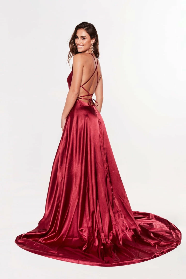One of your favourite gowns with a new twist, introducing the Dimah gown with lace up straps. This gorgeous gown is made from luxurious thick satin fabric and features a v-neckline, hidden side slit, A-line skirt and a long train. The satin fabric has minimal stretch.