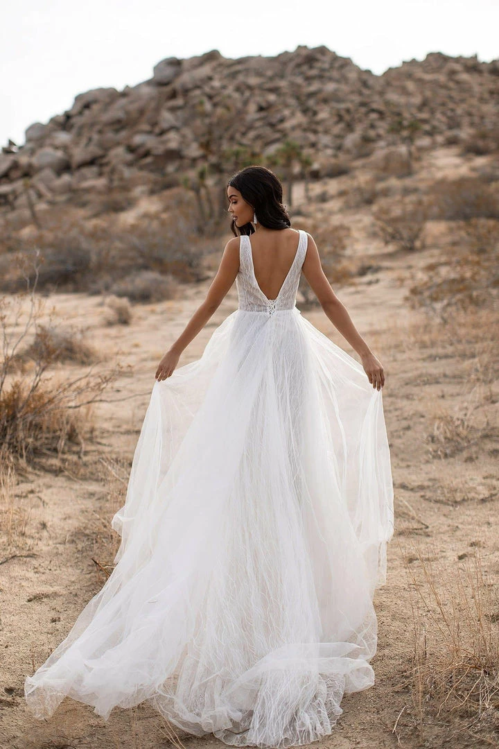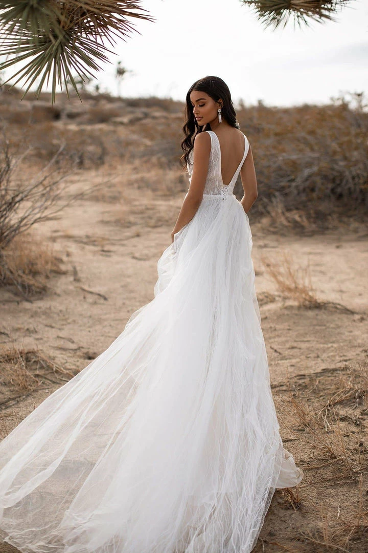 The Hazel Gown is the prettiest bridal gown ever, with stunning floral embroidery on the bust, an open back and textured pattern all over. Feel like a princess with dreamy tulle flowing behind you and a delicate lace-up back.