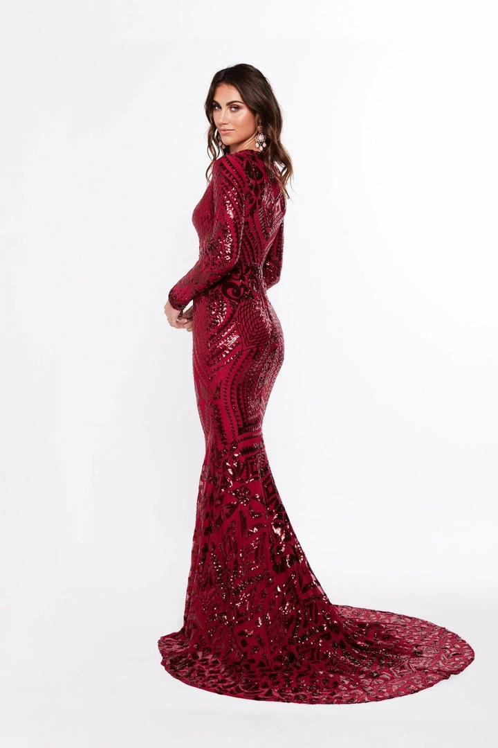 The Julieta is an elegant long sleeve sequins gown. It is made with beautiful geometric fabric and has a lot of stretch to it. The features on this gown are an elegant v neckline, long sleeve and a small mermaid train. The material is quite stretchy and there is an exposed back zipper.