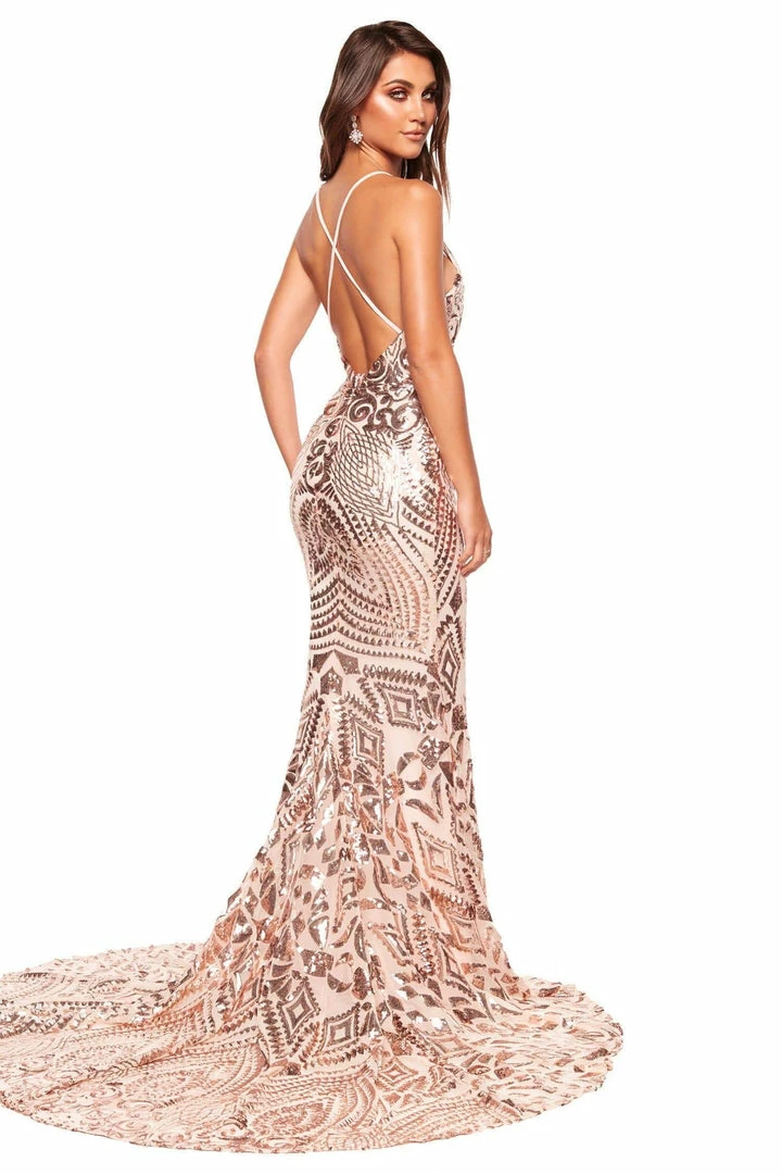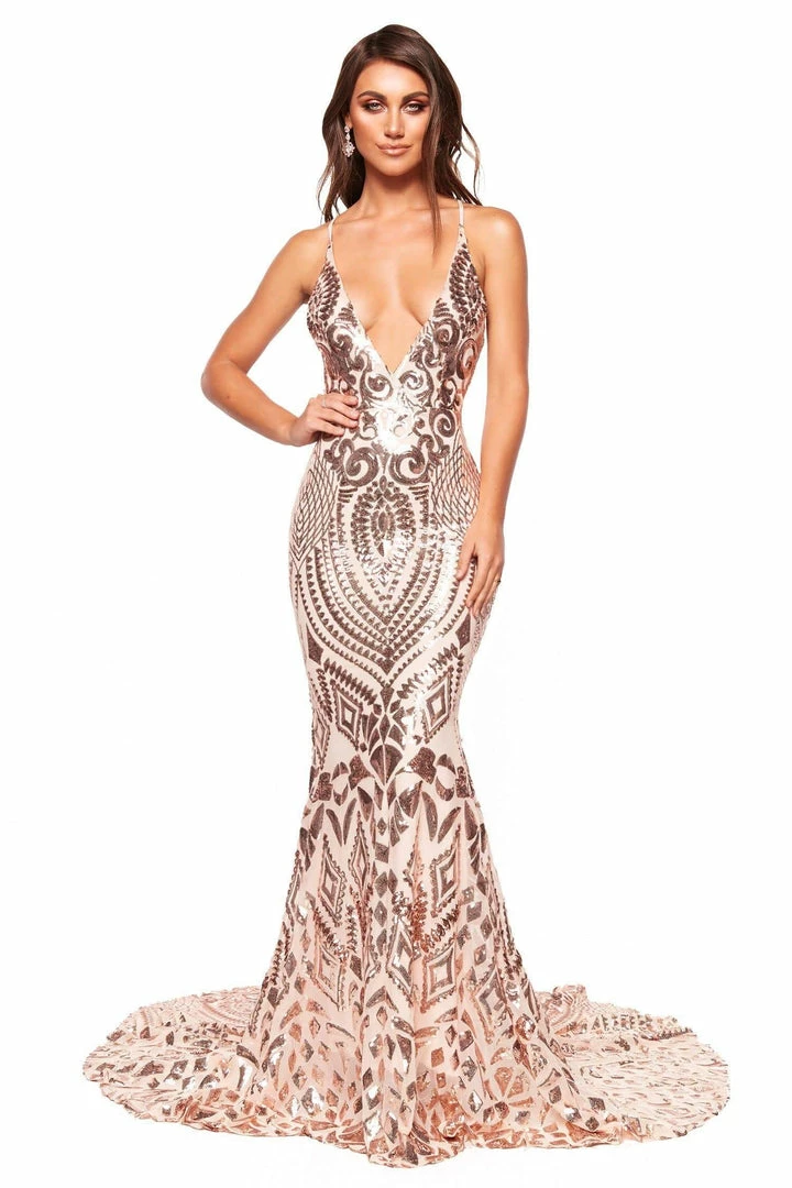 Feel & look amazing in our Kalila Sequin Gown. This gorgeous gown features a plunge neckline, criss-cross back straps and a figure-hugging fit. Made from luxe shimmering sequins fabric with a long train. Super stretchy & lined.