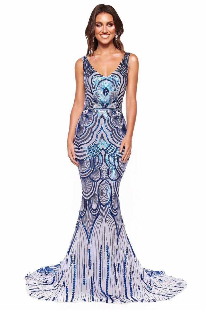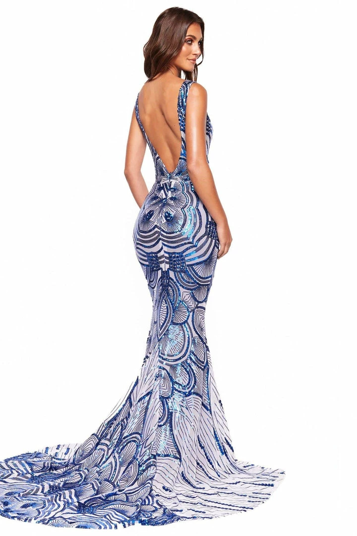 Introducing the incredible new Kimora Sequin Gown from our new collection. This gorgeous gown is everything a girl could dream of for her prom – figure-hugging, show-stopping & covered in sparkling sequins in a stand-out pattern unlike any other gown. Features of this gown include a V-neckline, low back and mermaid silhouette and train. The fabric is super stretchy & lined.