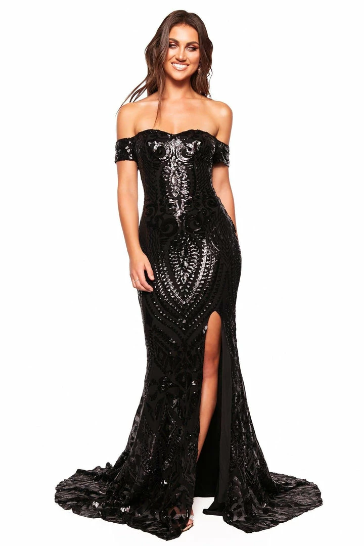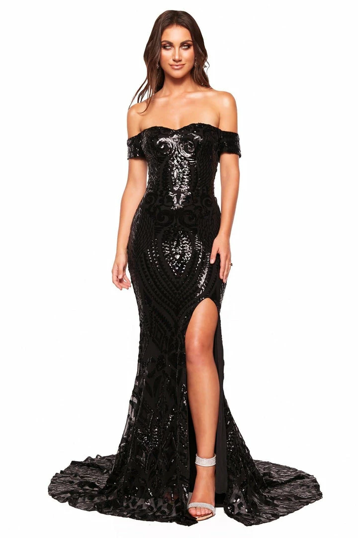 The Kora Sequin Gown is a stunning off-shoulder gown in black. Made from incredibly sparkly patterned sequins fabric and featuring off-shoulder sleeves with a thigh-high slit. Fabric is stretchy & lined.
