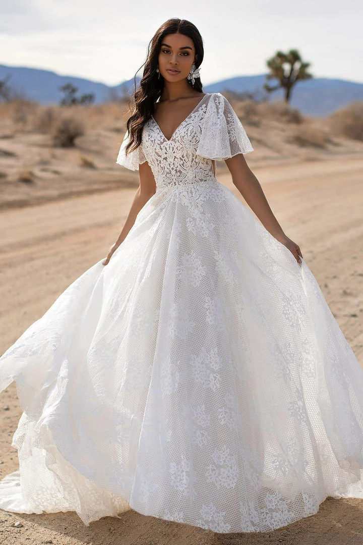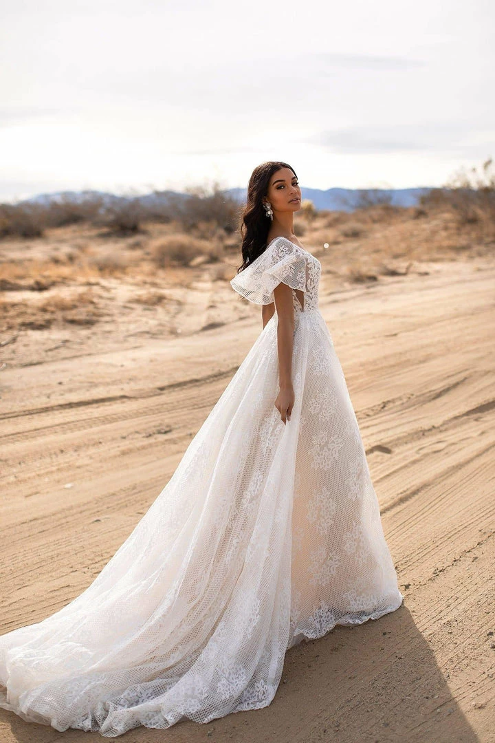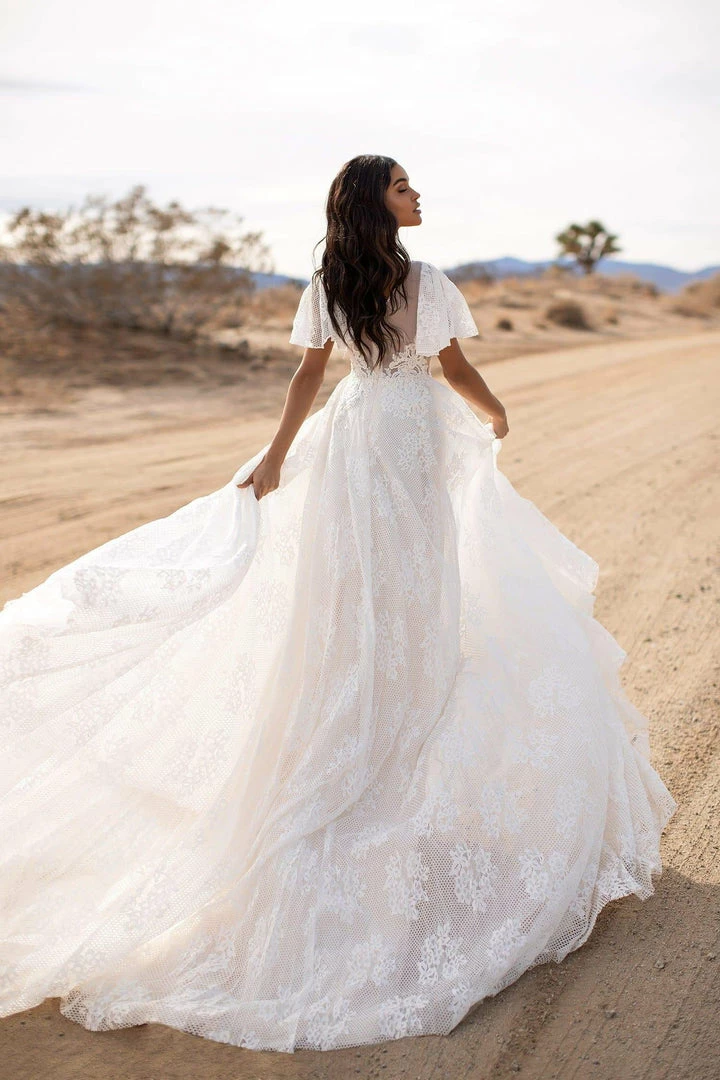 Fall in love with the Lyra Gown. Lyra features stunning delicate flare sleeves, a long train and is made from stunning nude & white layered tulle & lace for a dreamy and luxurious gown. Lyra is a timeless classic that will make for an unforgettable bridal look.
