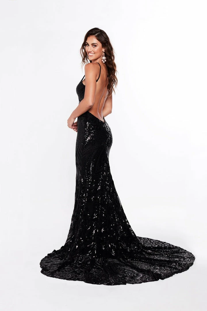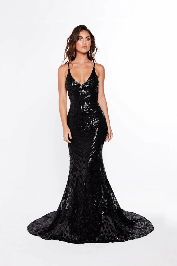 Turn heads in our Mariana Gown. Glamorous statement evening gown in geometric fabric. Featuring a classic v neckline and a low back with mermaid train. This fabric is super stretchy and is made to flatter your figure.Â