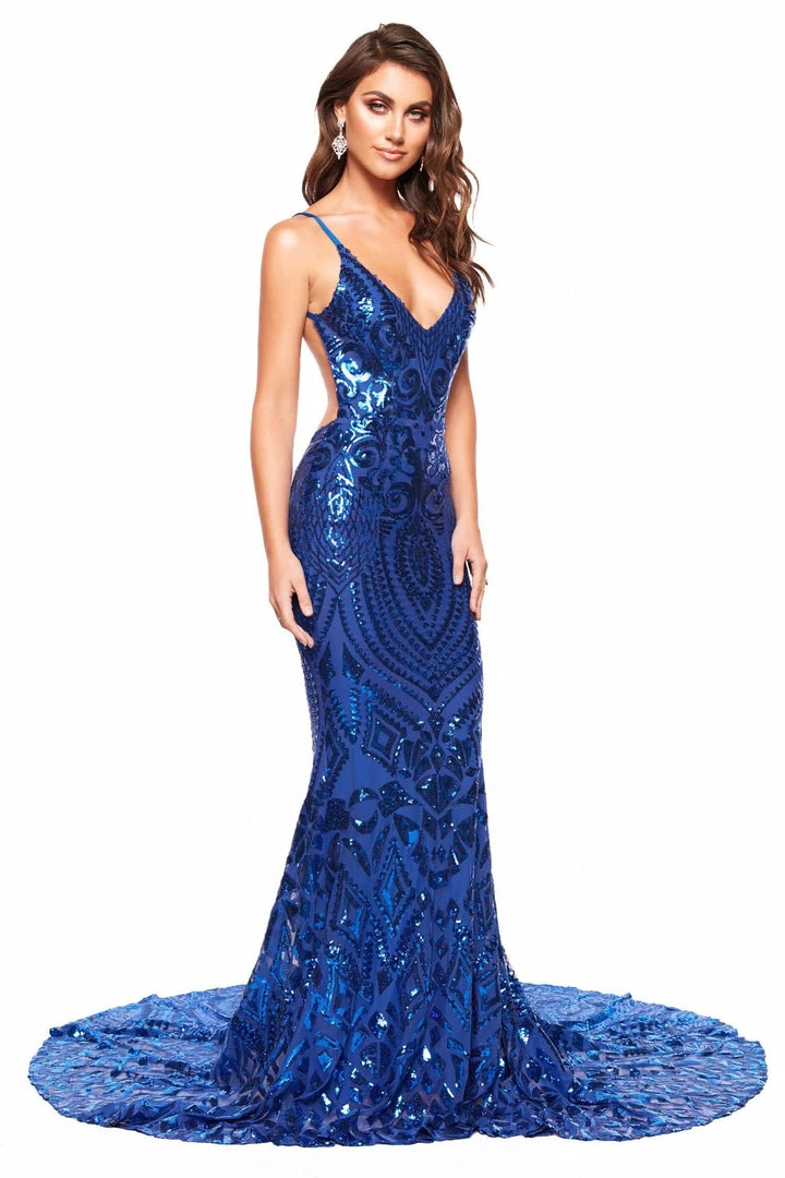 Turn heads in our Mariana Gown. Glamorous statement evening gown in patterned sequin fabric. Featuring a classic V-neckline and a low back with mermaid train. This fabric is super stretchy and is made to flatter your figure.Â