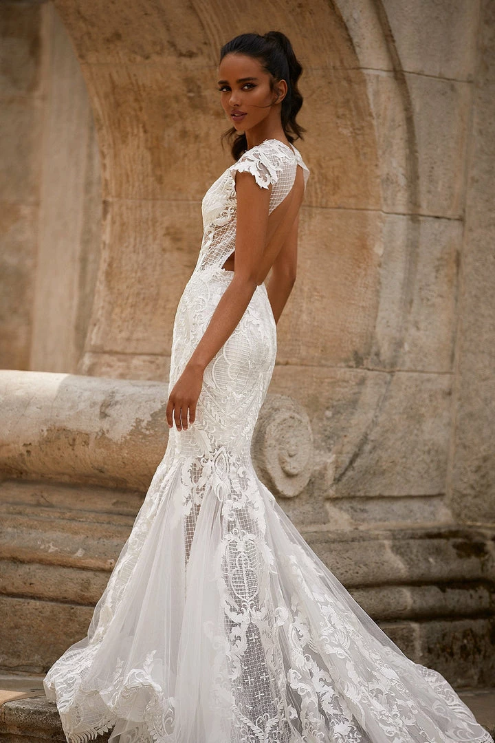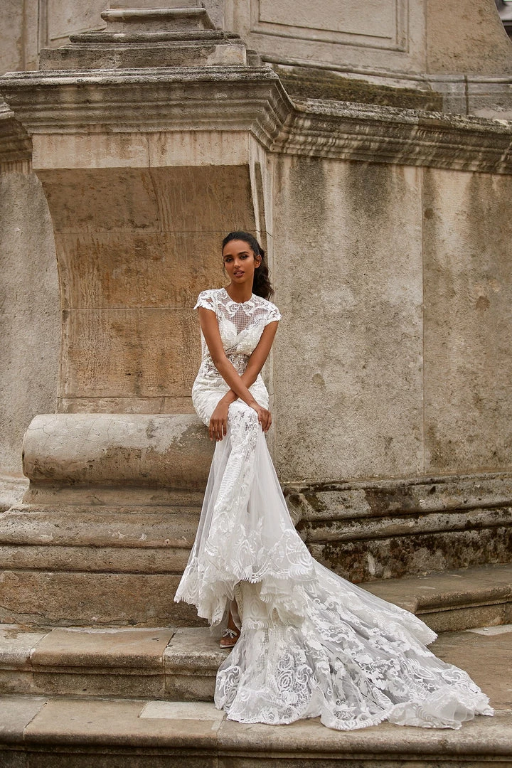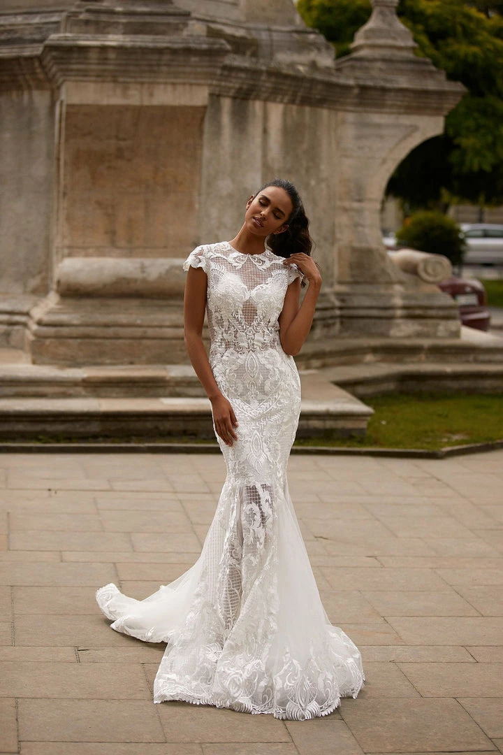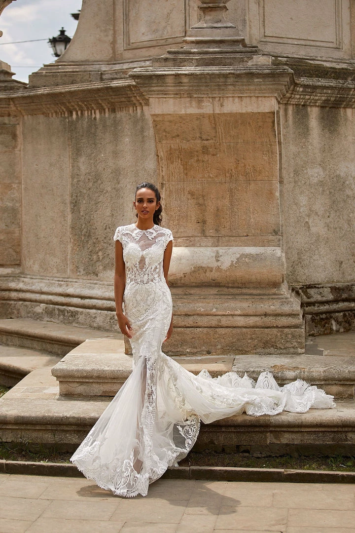 Rachelle is the epitome of sophistication and style. This high neck lace gown features short sleeves, an open back & mermaid silhouette with a train. Made from luxe fabric with sheer sections throughout.Â