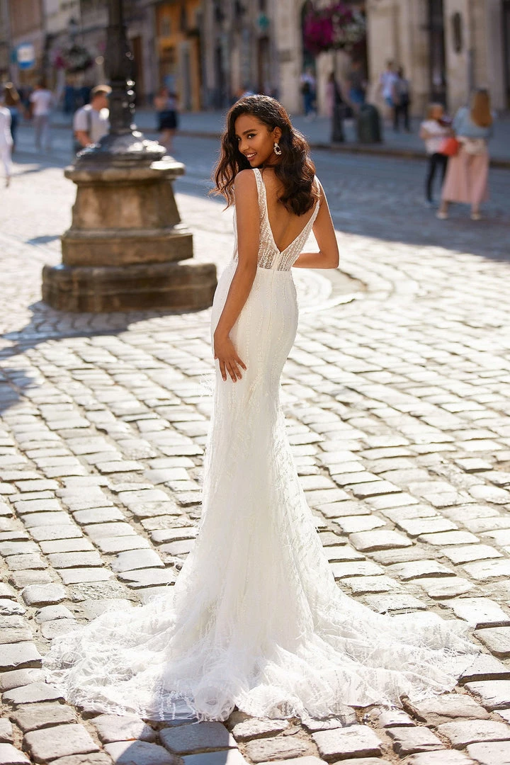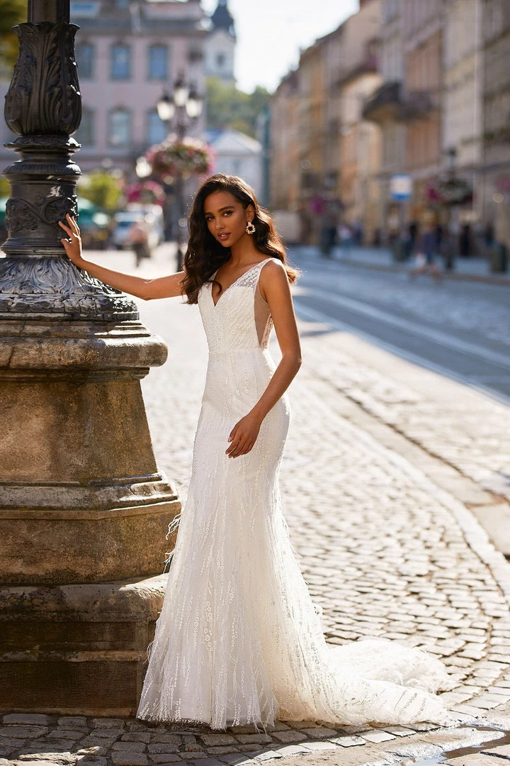 The definition of goddess vibes. The breathtaking Seren Gown is made from luxe textured fabric covered in shimmering sequins & pearls with a faux feather train. Seren features a v-neckline, open back & mermaid silhouette.