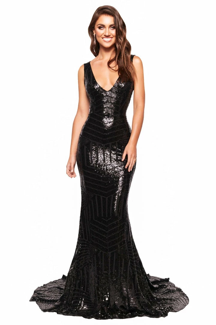 Serena features a striking sequins pattern, deep V-neckline and low back. This gown has a figure-hugging mermaid silhouette and is as sparkly as it is sexy. Fabric is stretchy to enhance your curves.Â