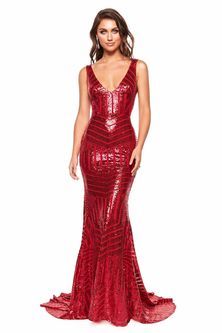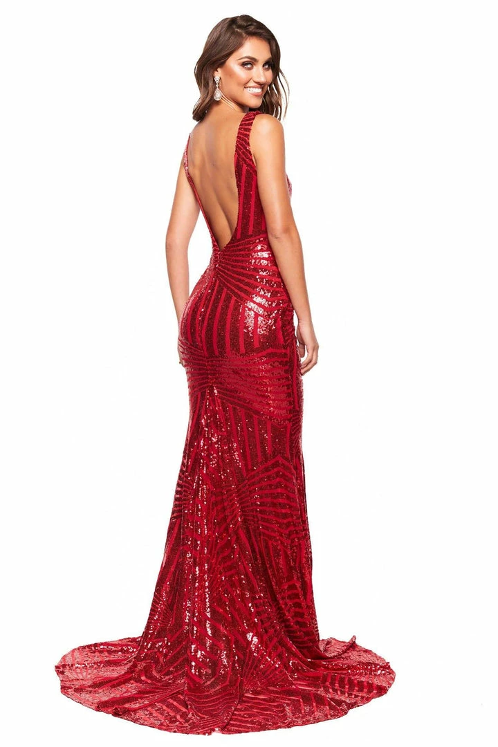 Serena features a striking sequins pattern, deep V-neckline and low back. This gown has a figure-hugging mermaid silhouette and is as sparkly as it is sexy. Fabric is stretchy to enhance your curves.