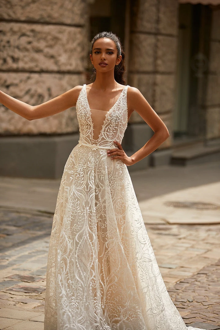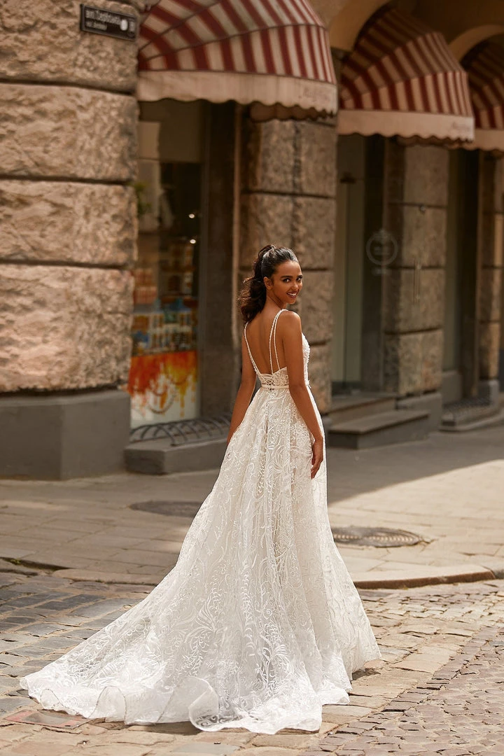 The stunning Noelle Gown is made from a luxe patterned fabric with delicate sequins throughout & subtle beading on the bustier. Also features a plunge neck with mesh insert, exposed back with lace-up & double strap detail.