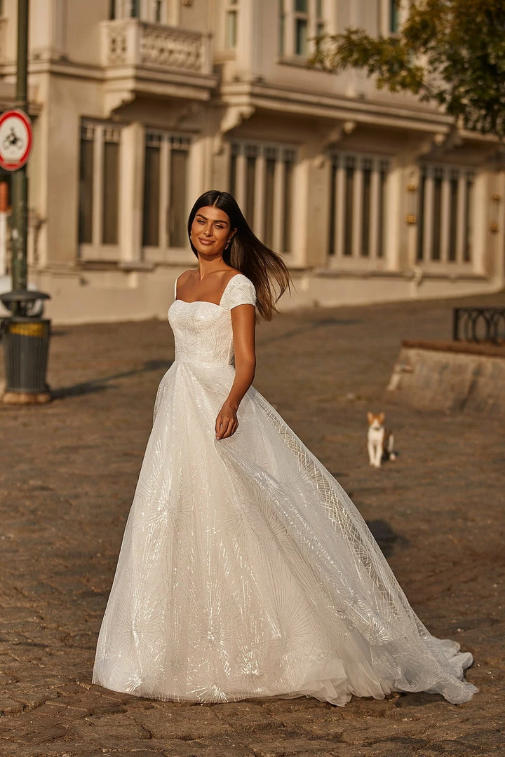 Sequin fabric, non-sheer, bust cups, straight neckline, scoop back, zip fastening, fake buttons, cap sleeves, lined, white lining, boning in the bust, non-stretch