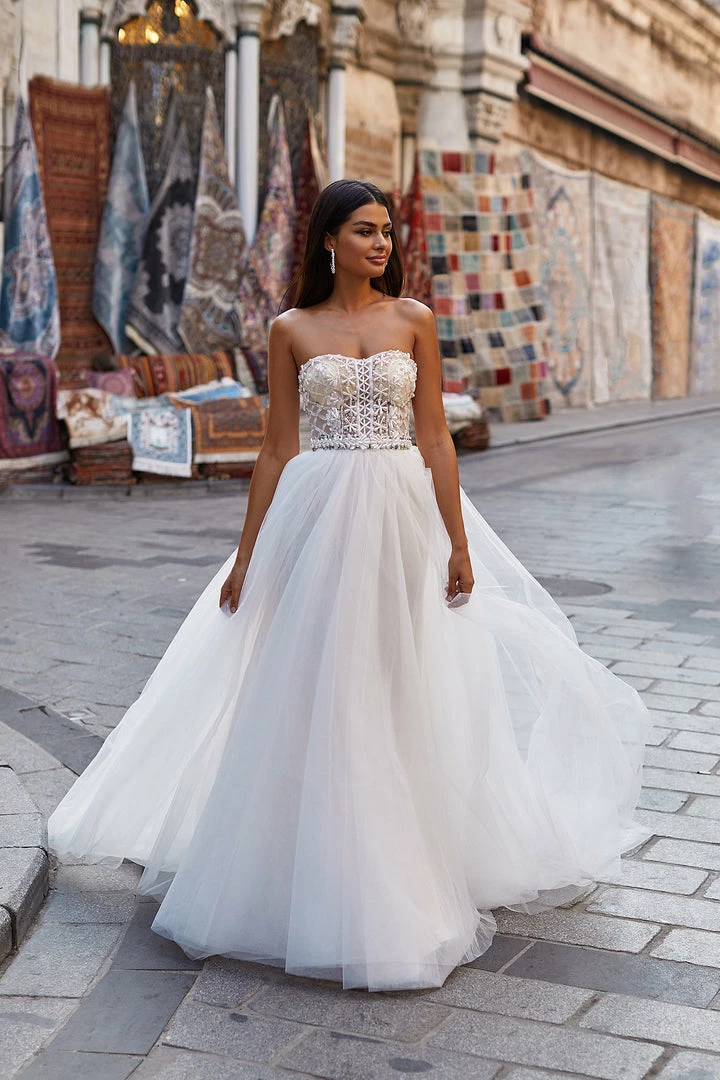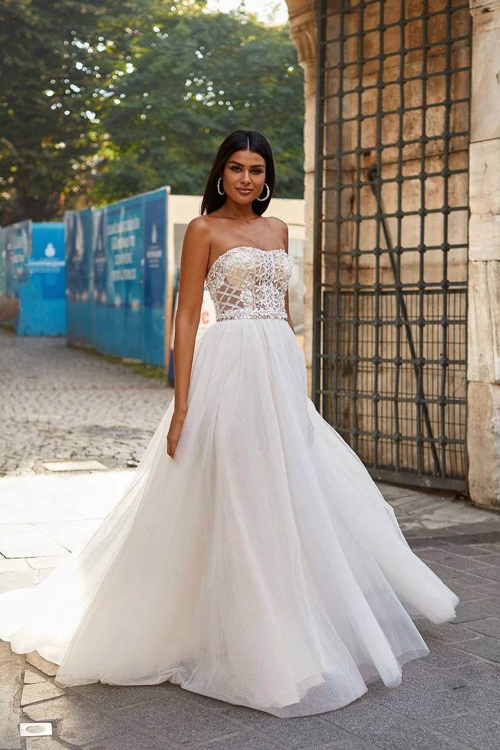 For the brides that love an extra dose of glamour. The Damla Gown adds extra feminity with its beaded bodice, detachable waistbelt, and flared tulle skirt. Elevated with its strapless neckline and lace-up back, The Damla Gown is the ultimate statement gown.