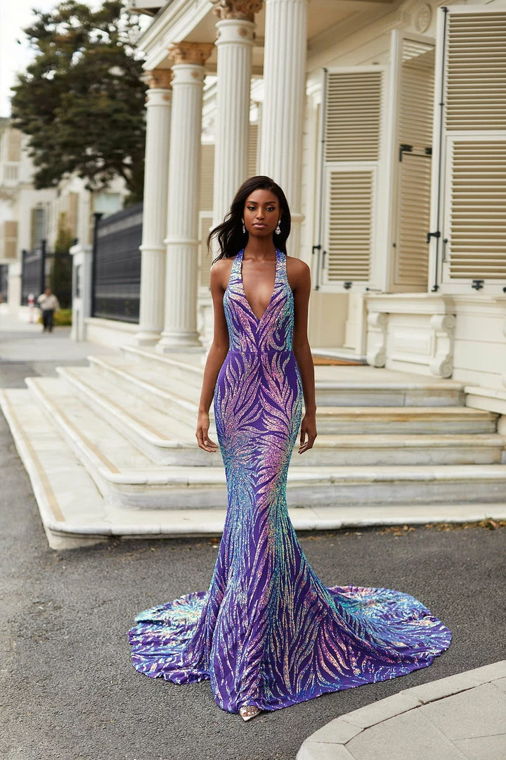 Diamante is a vibrant purple mermaid gown with multicoloured shimmering sequins all over in a striking pattern. Features a plunge halter neckline & open back with a statement mermaid train. The perfect gown for girls that want to stand out at their special event.