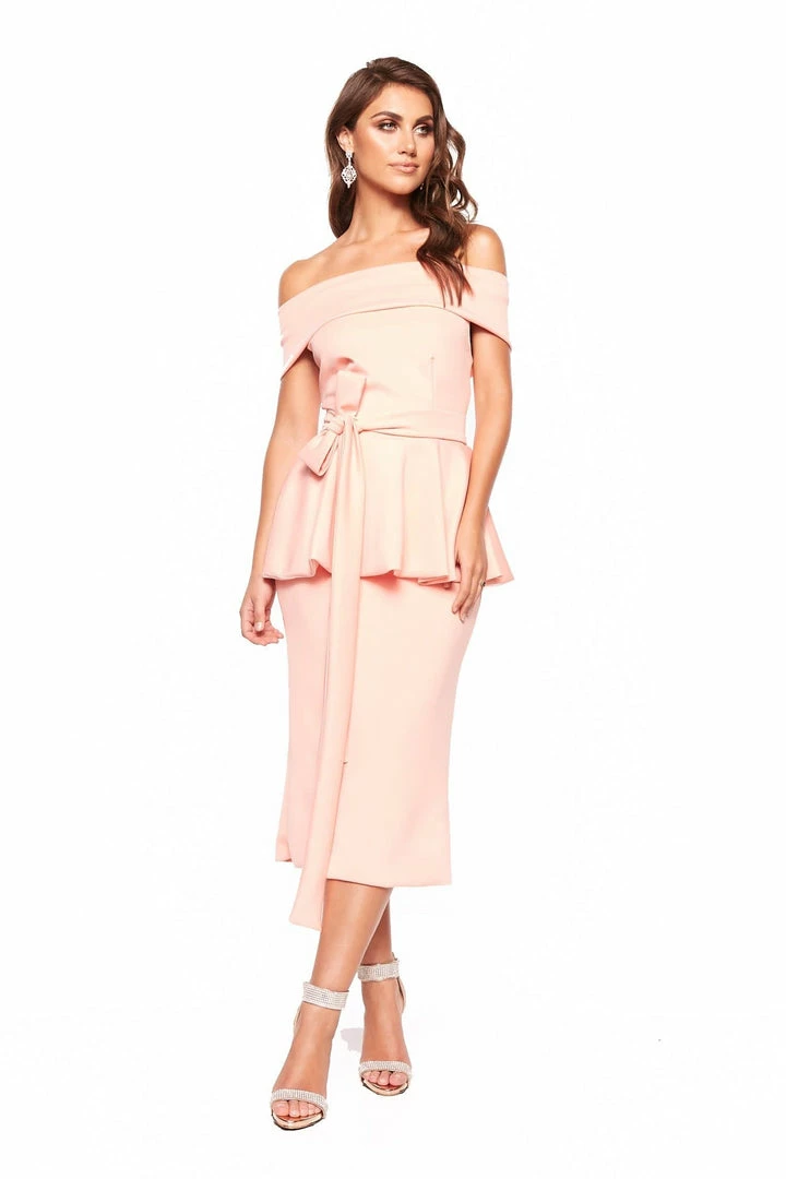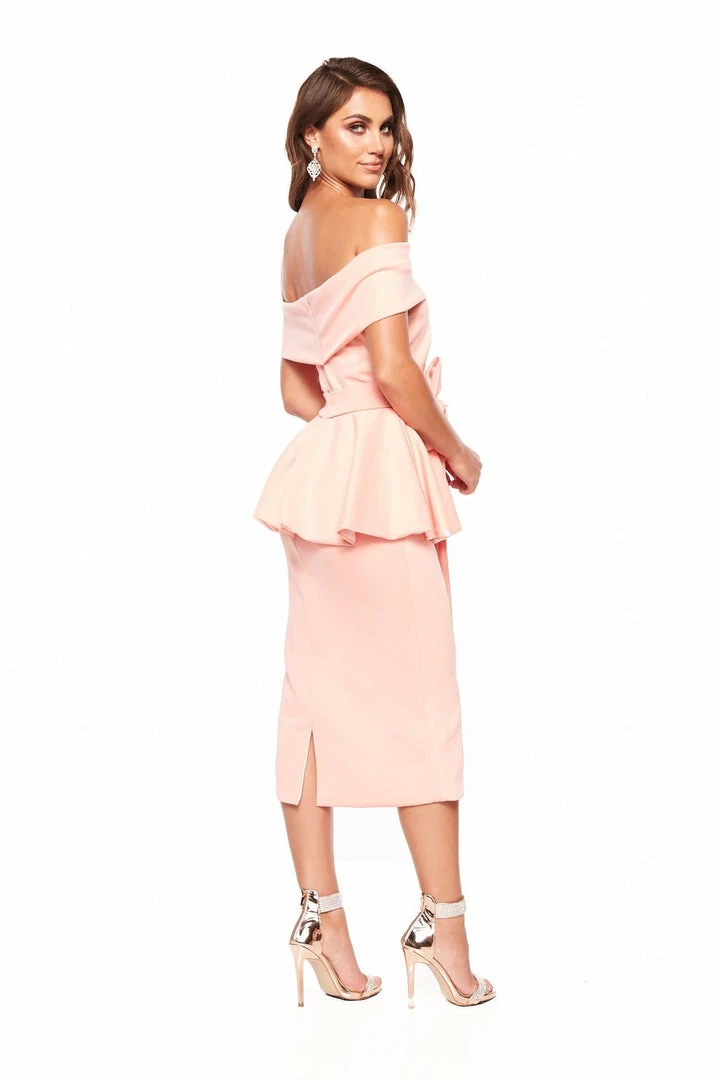 The Camila Dress is a classy and timeless cocktail dress. Features an off-shoulder bodice and complete with a tie-up waist and feminine frill detailing. This dress is midi length and made from smooth, stretchy & lined ponti fabric.