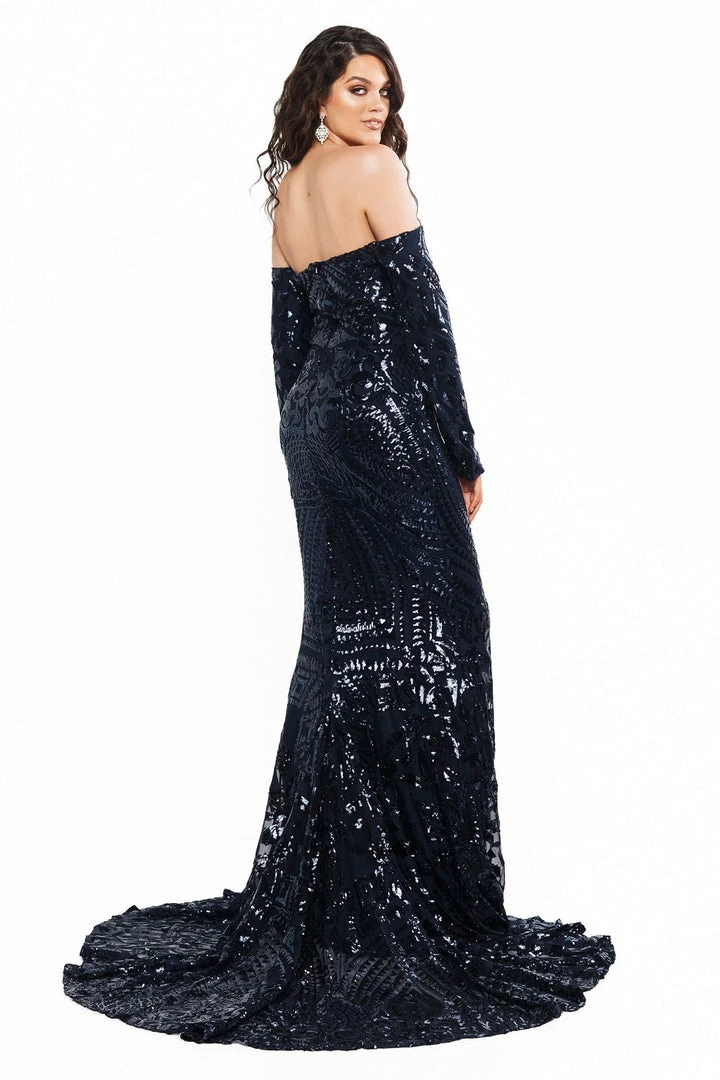 The elegant Amara Sequin Gown is a timeless off-shoulder gown with long sleeves. Made from our signature sparkly patterned sequins fabric which is lined & stretchy.Â