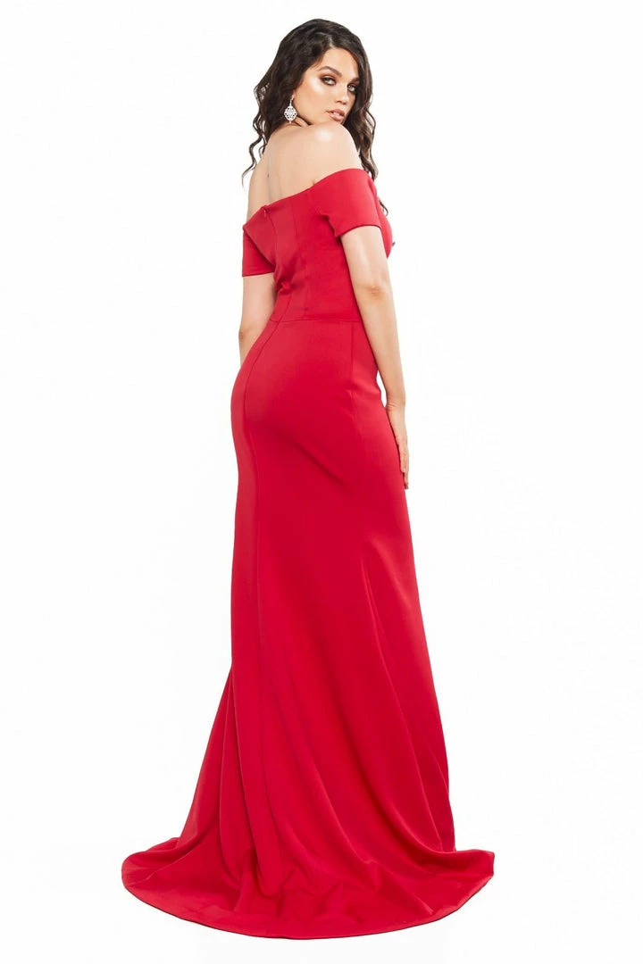 This gorgeous gown is made from luxurious stretchy ponti fabric that will show off your best assets. This dress features sweetheart off the shoulder sleeves and a side slit. There is a small mermaid train and an exposed zipper on the back. The fabric is very stretchy and double lined.Â