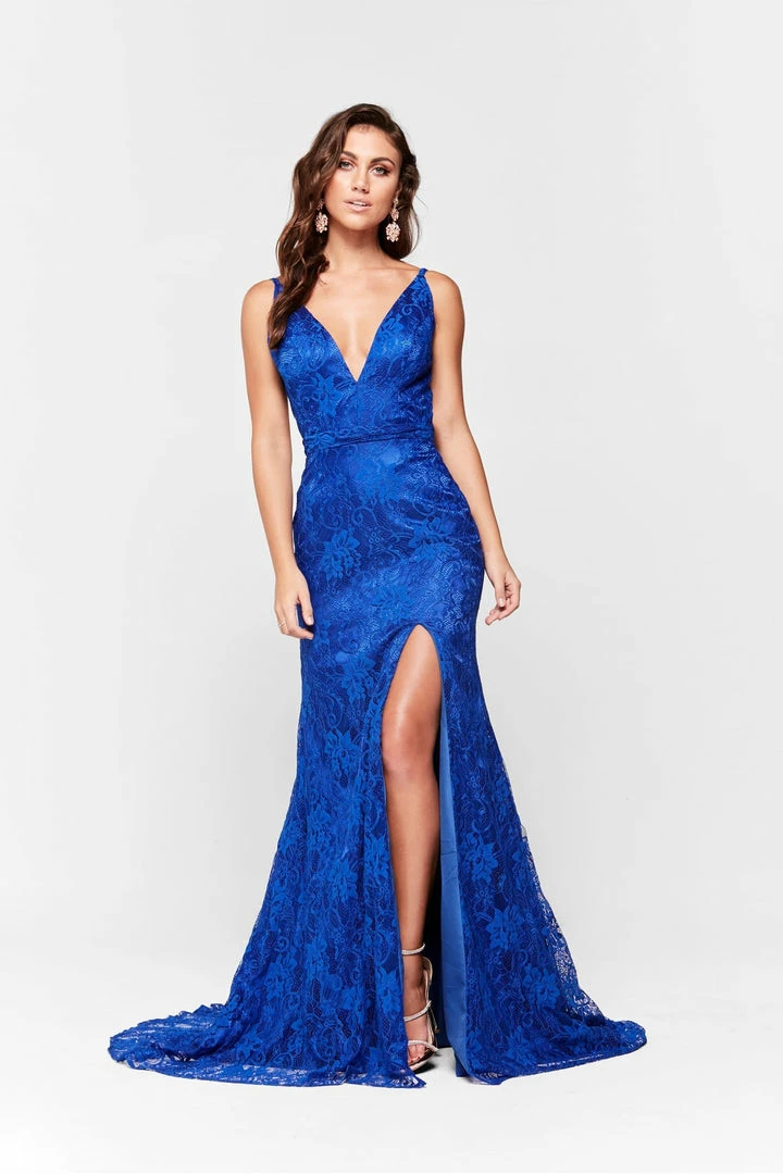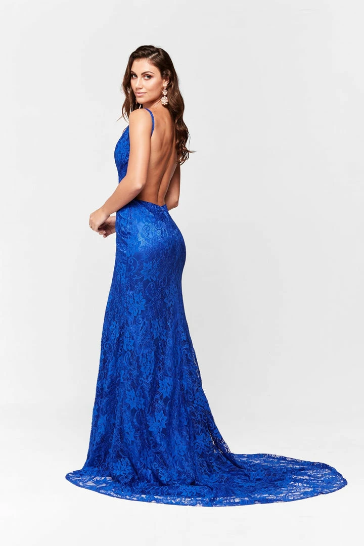 The Ayla gown is sophisticated and glam. The features on this gown include v neckline, front side slit and low back. It is lined all the way to the train. This fabric has minimal stretch and an exposed back zipper.