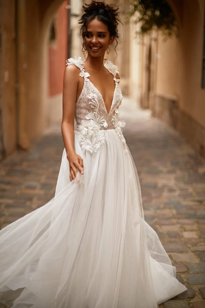 The Eliah Gown will take your wedding look to a whole new level. This gorgeous gown features a deep plunge neckline and a floral embroidered bodice with beading & sequins. Eliah also features a low back with lace-up detail, side slit with mini skirt lining and a train flowing behind.