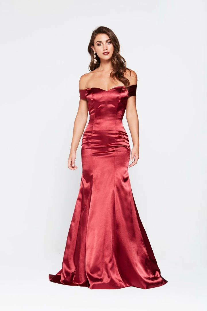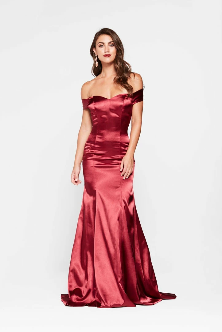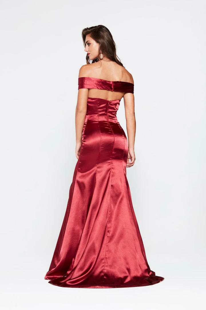 The Fiona gown is made from a thick satin and is double lined to hug and highlight your curves. This gown features a classic sweetheart neckline, off the shoulder straps with a wrap back and a mermaid sweep train. This fabric has minimal stretch and there is an exposed back zipper.Â