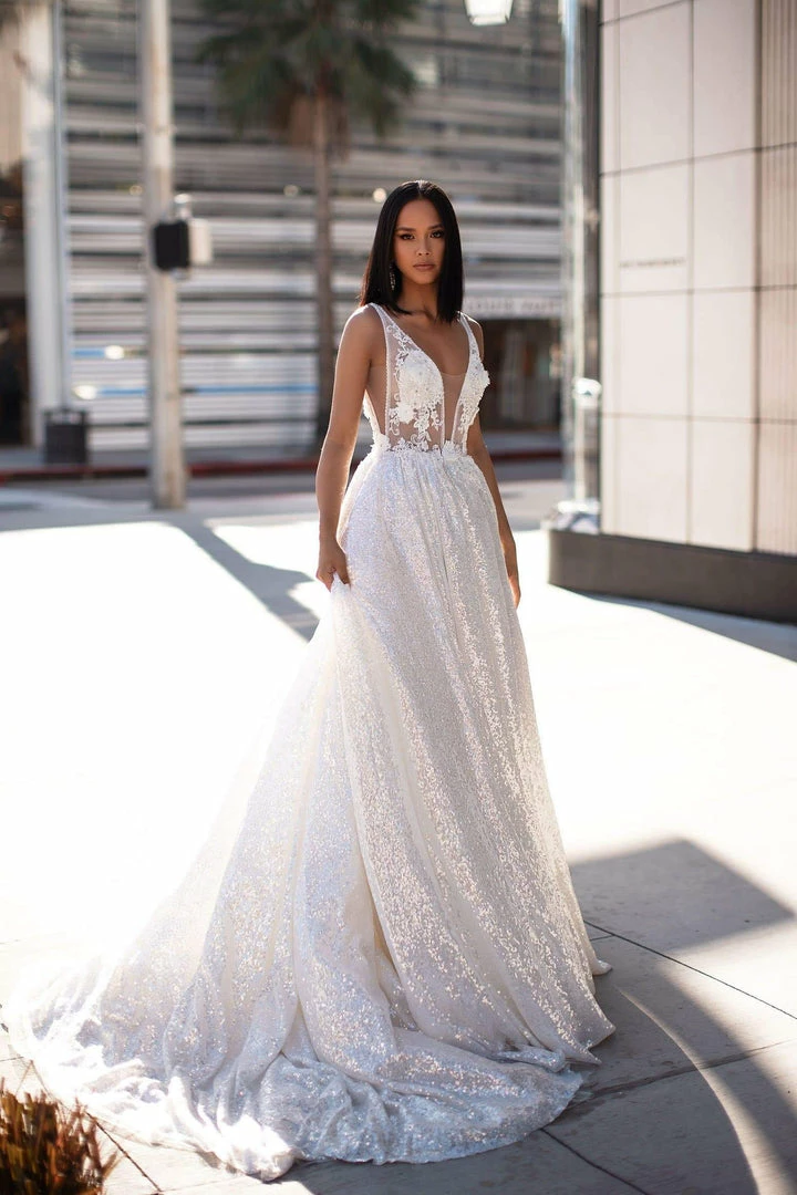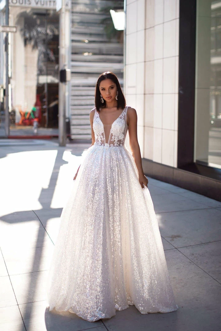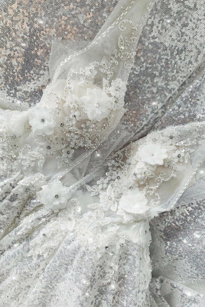 Shine like a Star at your Prom with our Kaliah Gown. Features 3D floral beading on the bodice and shimmering sequins on the skirt. The bust is sheer and the gown comes with the cups as per the pictures. The bottom is fully lined with tulle. This fabric has minimal stretch.Â