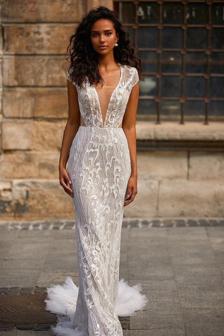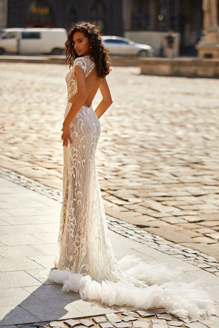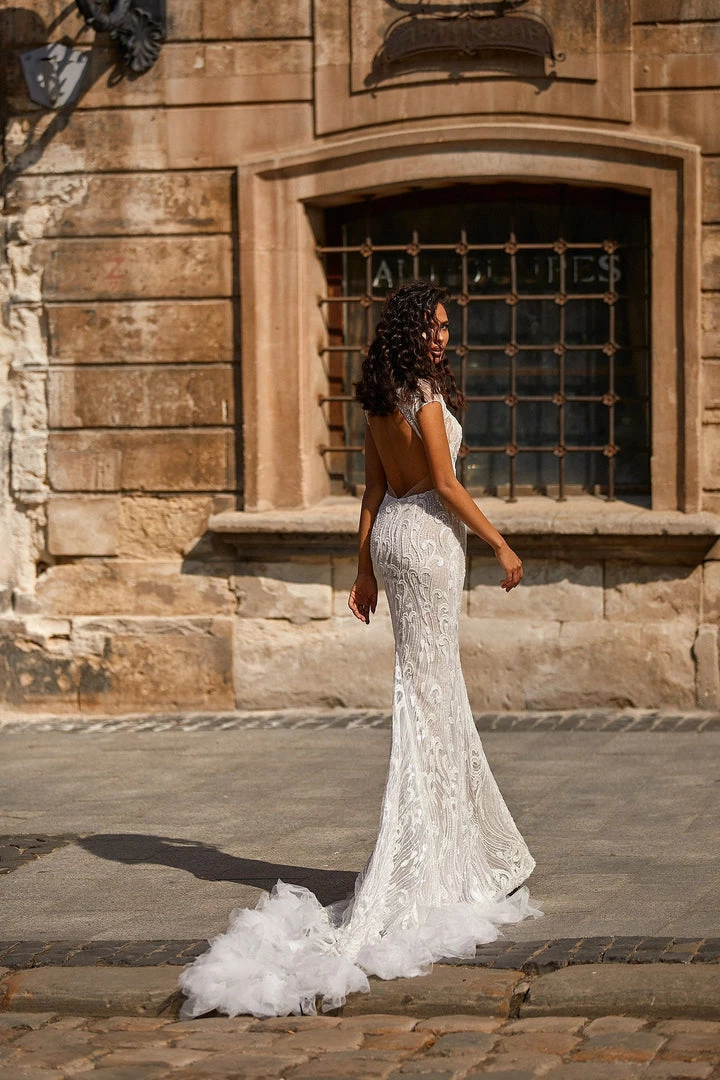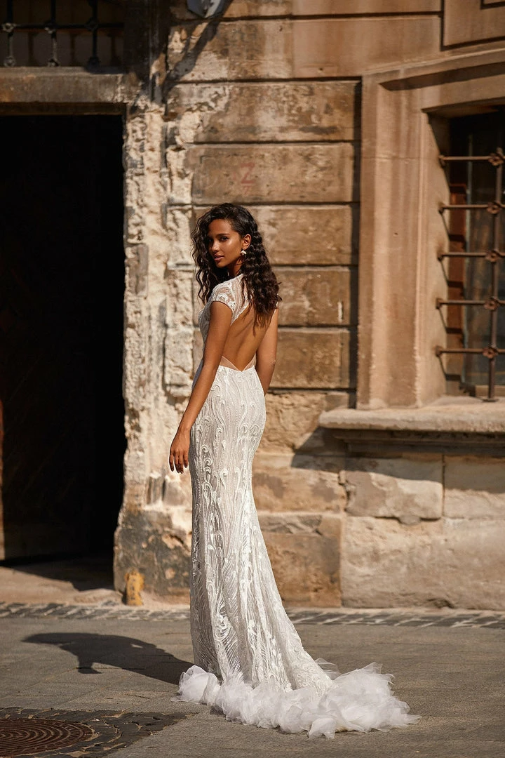 Introducing the stunning Lyana Gown. This bridal gown is made from luxe patterned fabric, covered in delicate beading and sequins. Lyana has a plunge neckline with mesh insert, short sleeves and fitted silhouette with a cut-out back & mermaid train. This gown will make you look so effortlessly elegant & sophisticated. Â