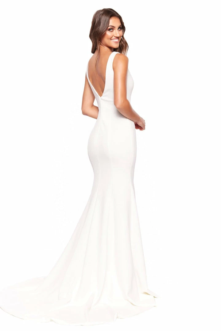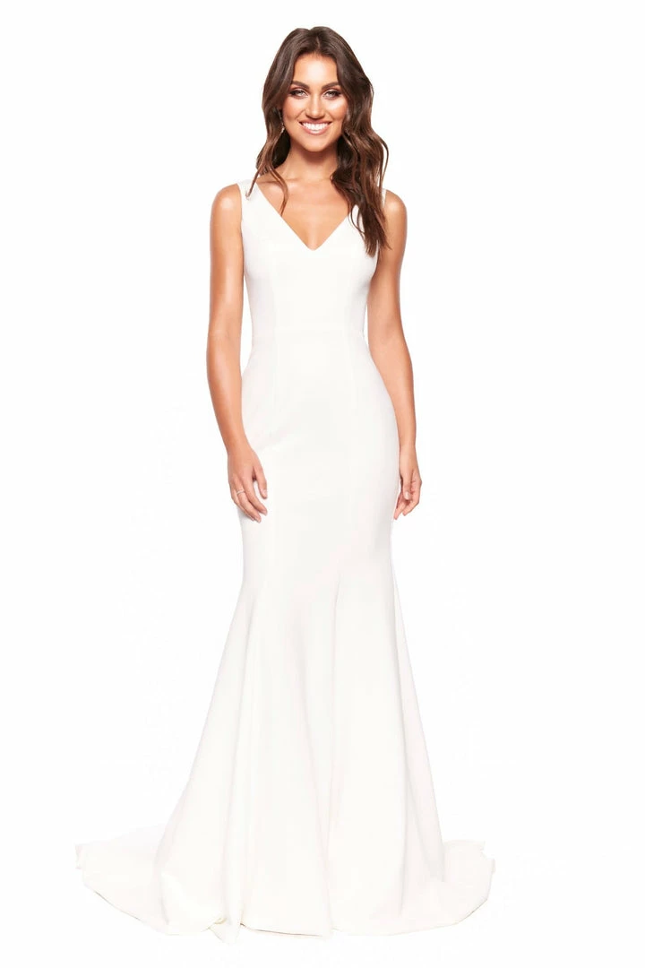 The classy & elegant Makayla Gown is a simple gown with a V-neckline, thick straps and an open back with a mermaid silhouette and train.Â