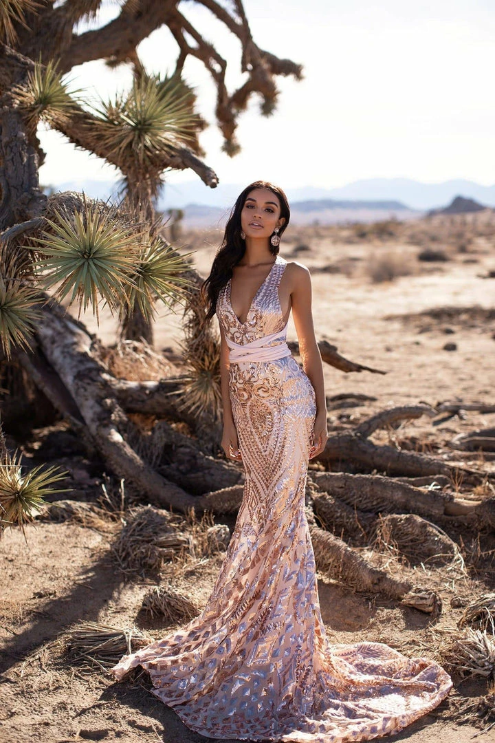 The stunning Sheyla Gown is the gown of your dreams. Made from luxe rose gold patterned sequins fabric which is stretchy to hug your body perfectly. This gown is also multiway style with baby pink straps to tie around your waist & back however you wish. This gown is so unique & stunning and will make you number one at your prom.Â