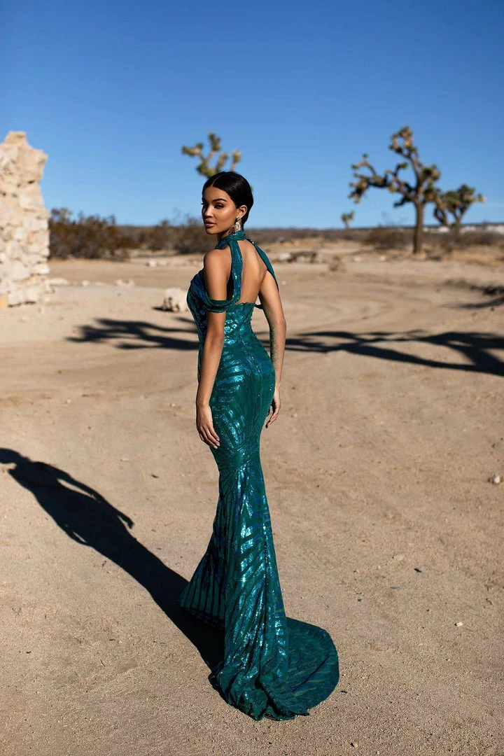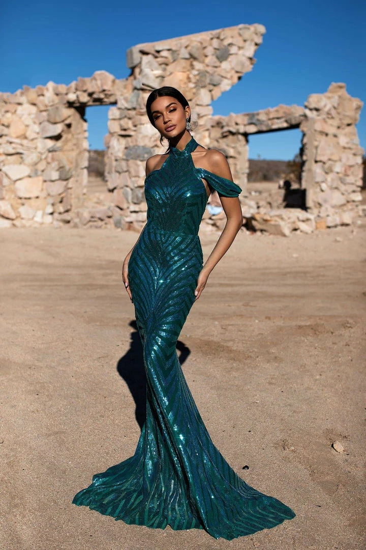 Major stylish goddess vibes in the Zella Sequin Gown. This beautiful emerald gown features a high choker neckline with off-shoulder straps and a striking sequins pattern. Zella is also fully lined & super stretchy with an open back.Â
