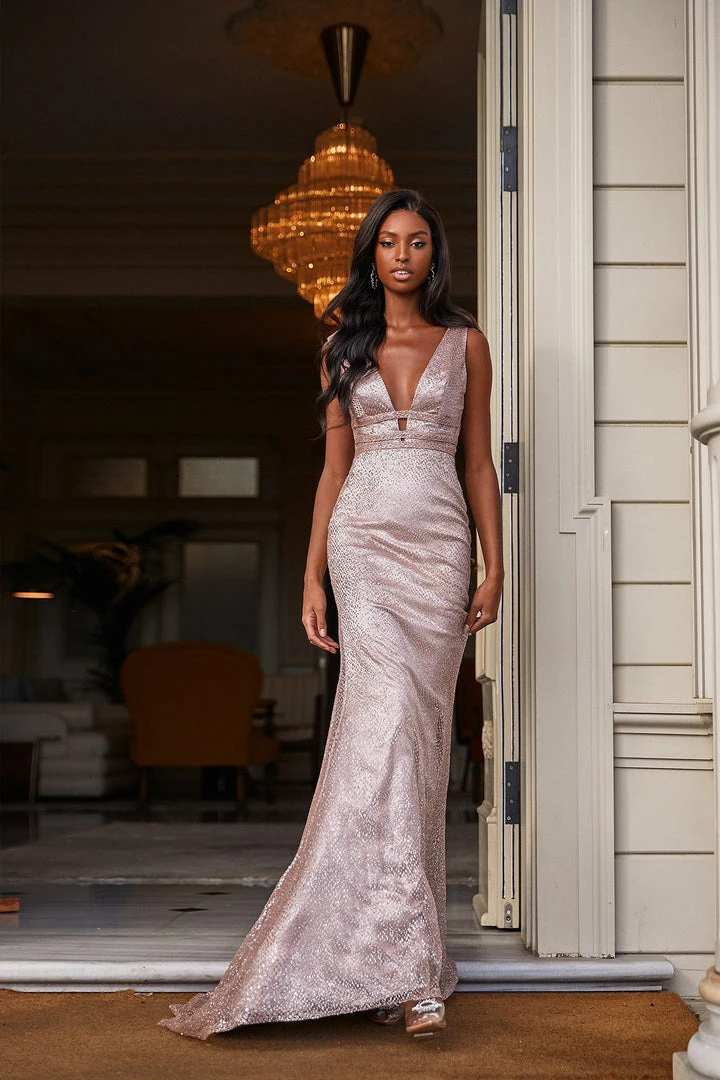 Sparkle at your next event in the Sarai Gown. This simple yet glamorous rose gold gown features a plunge neck, waist cut-out detail and mermaid train.Â