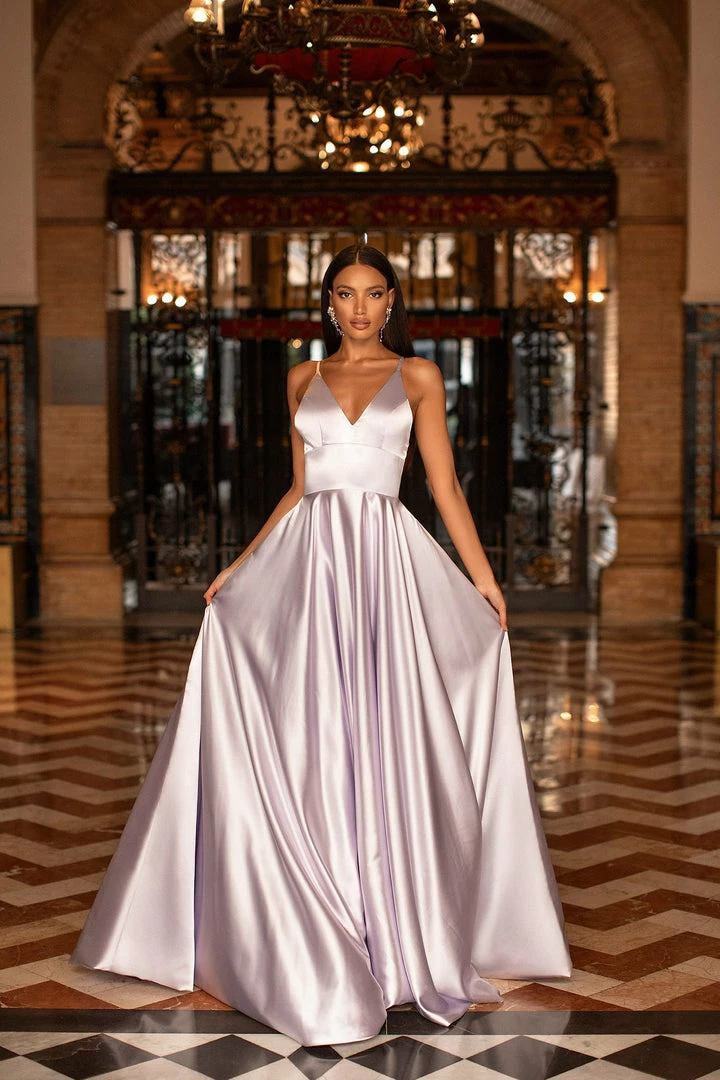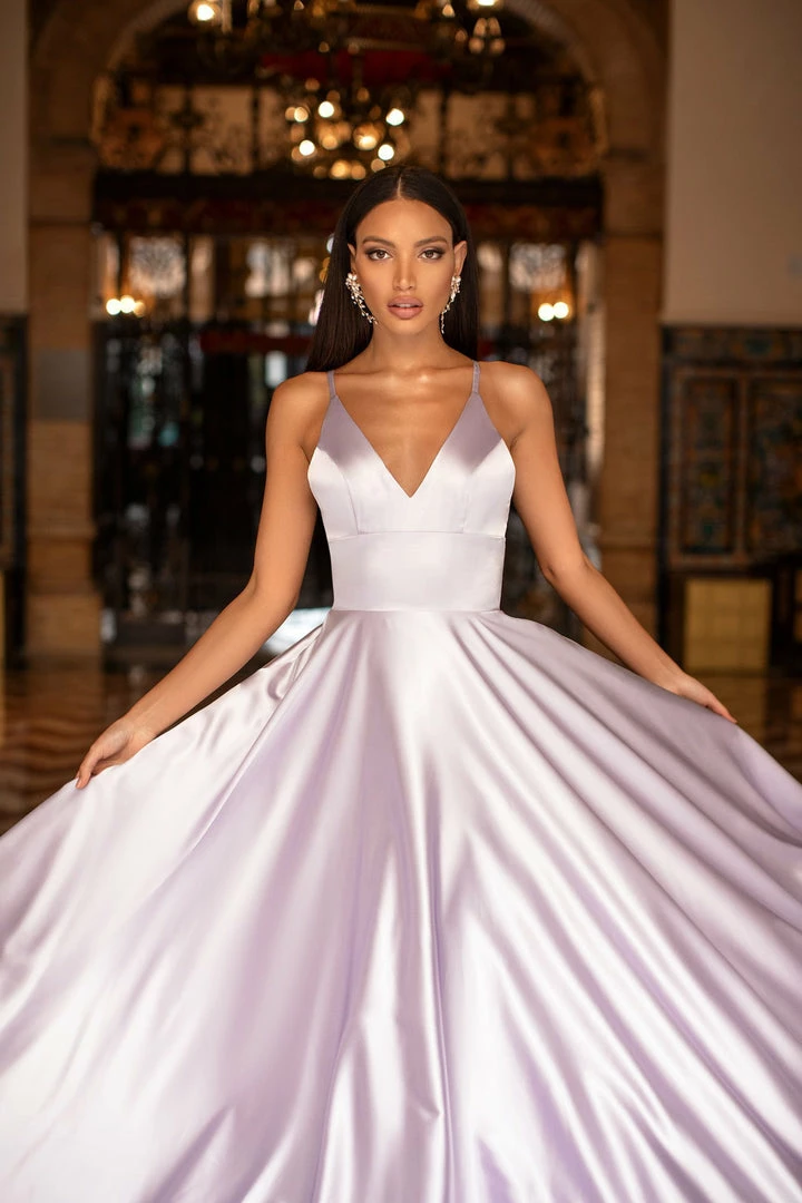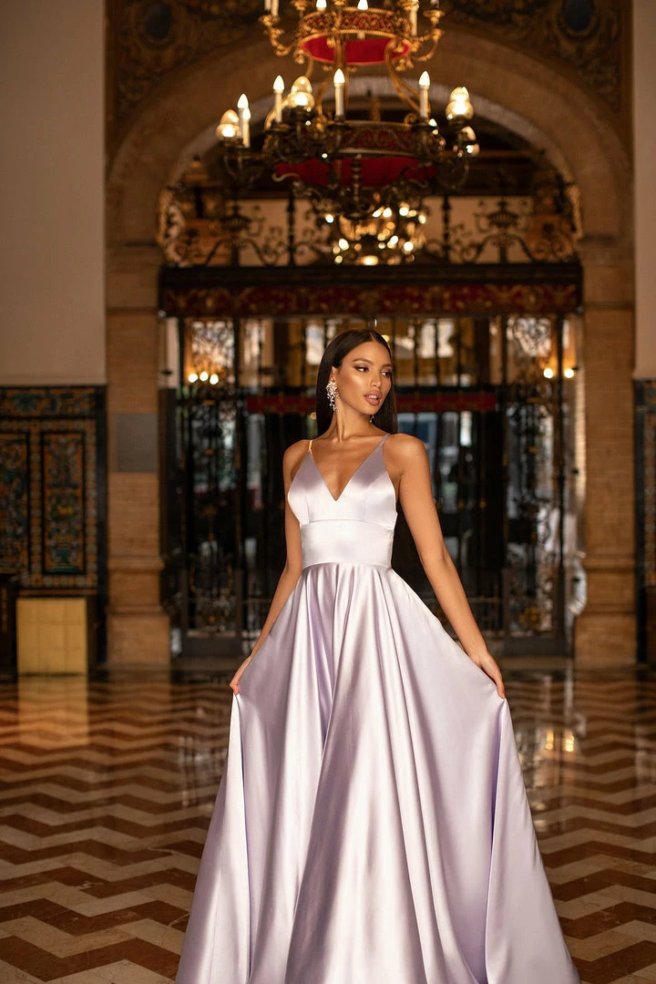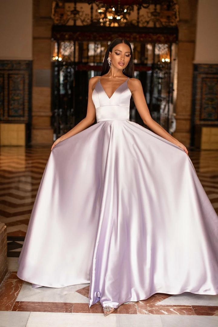 Introducing Maliyah, the silky satin gown you need in your life. This gorgeous lilac gown features a v-neckline, a-line skirt with a train & thin straps. Simple yet luxurious & perfect for every girl.Â