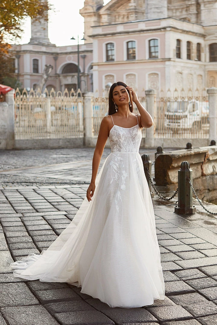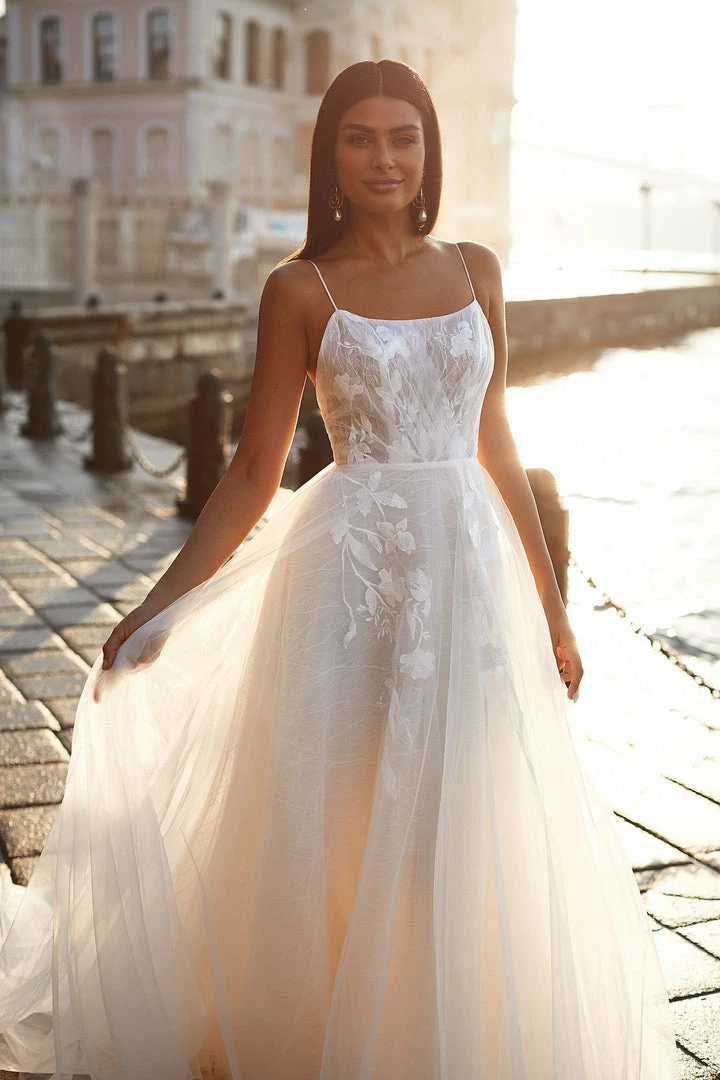 Semi-sheer bodice, tulle criss-cross paneling overlay on the bust, cream skirt underlay, non-adjustable strap, lace-up back, 2 x tulle layers, 2 x lace layers, a-line fit, straight scoop neckline, underlined train, low back