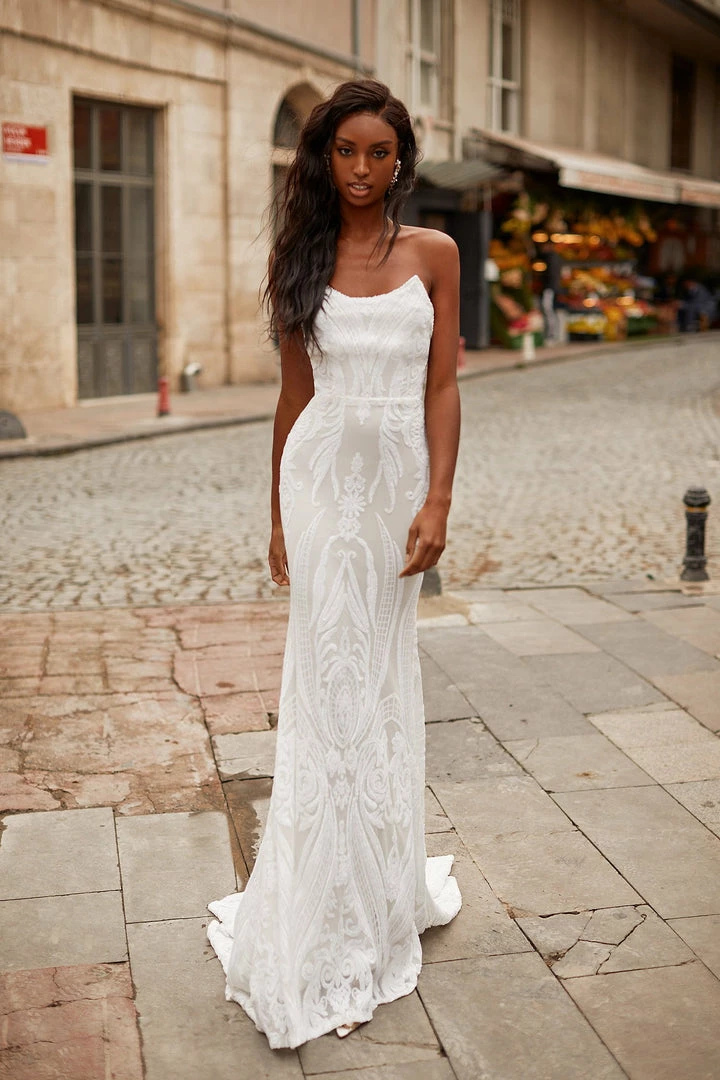 The hottest style in the hottest colour right now. Ramira is made from luxe emerald patterned sequin fabric & features a strapless scoop neckline & mermaid silhouette with a train. Turn heads & look flawless from every angle in this incredible gown.