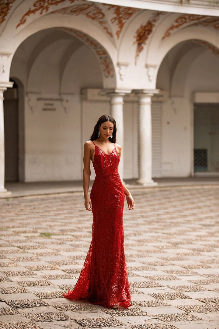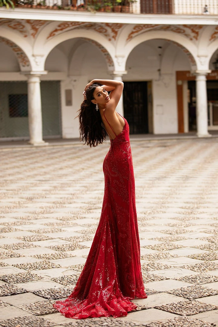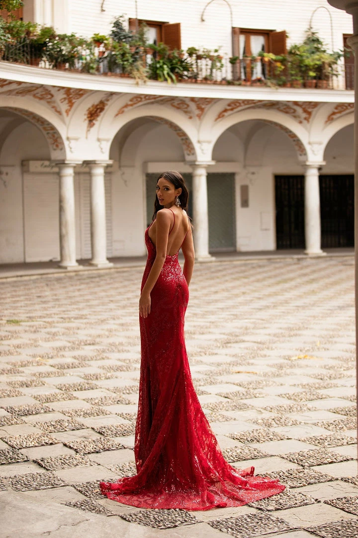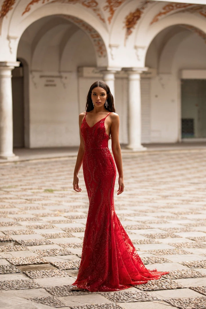 Look like a bombshell in the Rendira Sequin Gown. This luxe backless sparkling gown features a v-neckline & thin delicate straps with a fitted mermaid silhouette & train. So gorgeous for any formal event.Â