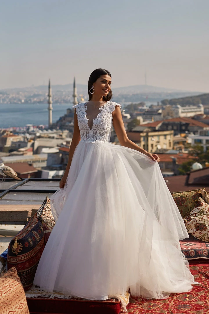 A timeless classic with updated design elements, the Sefa Gown has the perfect combination of both traditional and modern features. Made with sweet cap sleeves, a low-v neckline, and a sheer nude back with button details. The A-line silhouette and tulle skirt bring the look together for the sweetest bridal look.