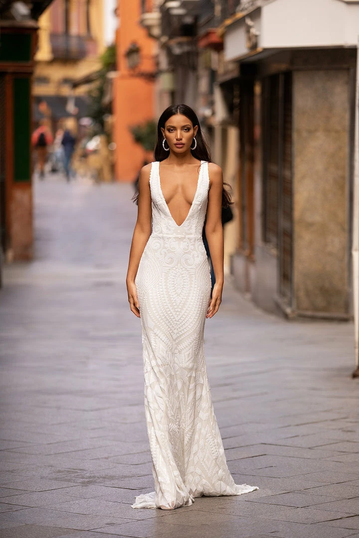 The perfect balance of minimal & glam, the shimmering Estera Sequin Gown is made from gorgeous patterned white sequin fabric and features a deep plunge neckline, scoop back and mermaid silhouette. Ideal for both a bridal gown or prom gown.Â