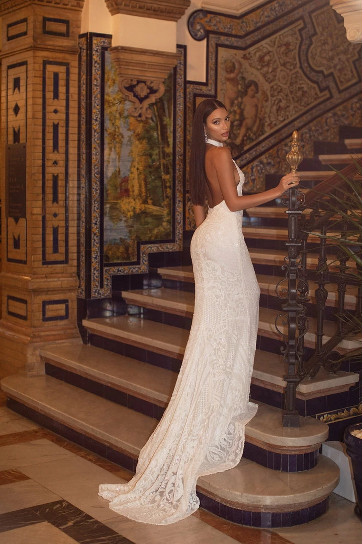 Elegant, glam sophistication all in one. This luxe shimmering patterned gown is so beautiful with a choker neckline & exposed plunge neck detail. This gown is also backless & features a mermaid train for making an entrance.