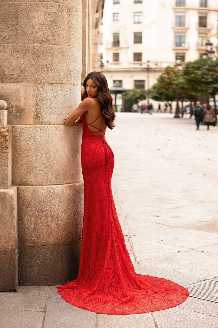 Look like a total bombshell in the Perla Shimmering Lace Gown. This stunning red gown features a deep v-neckline, thin straps with a lace-up back and mermaid train. This gown is stretchy & curve hugging, and fully lined. You’ll turn heads in Perla.