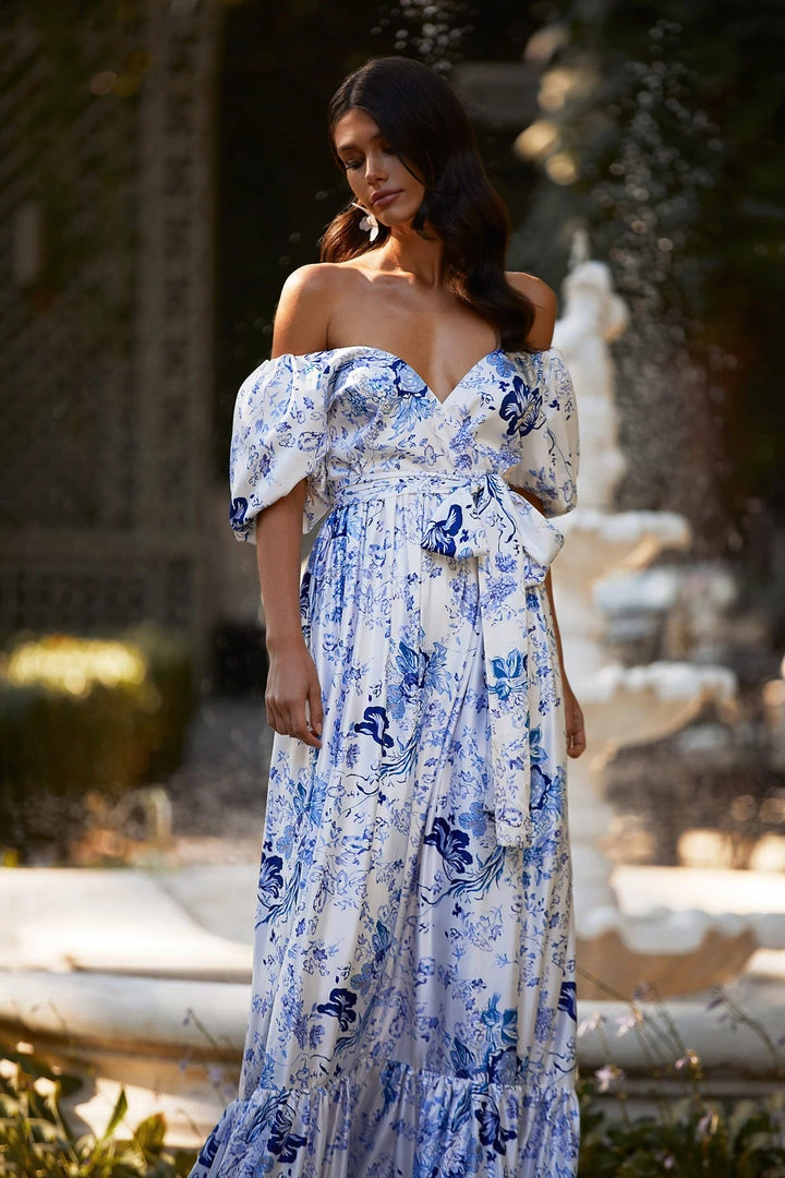 The Dara Dress is made from white & blue floral print fabric & features off-shoulder puff sleeves, wrap around waist tie & flowing a-line maxi skirt. You can wear this style on the shoulder or off the shoulder like in the picture.Â