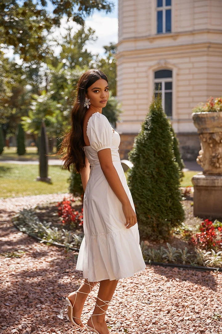 A classic must-have style. The Katina Dress is an elegant white a-line midi dress with a classic bustier, puffy sleeves & frill hemline. The perfect day dress, pair with strappy heels for an elegant chic look.