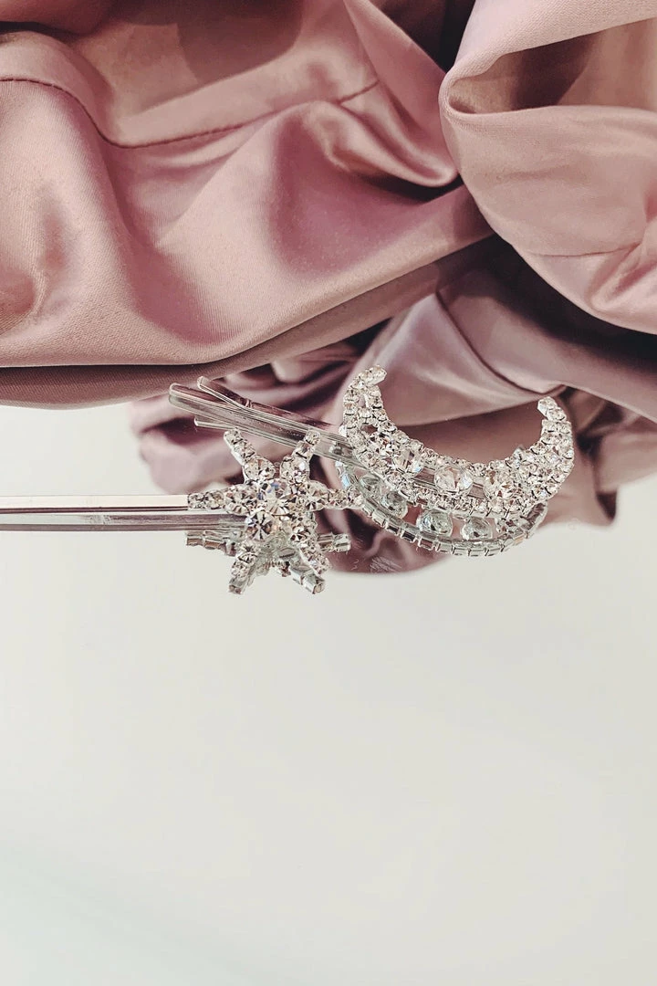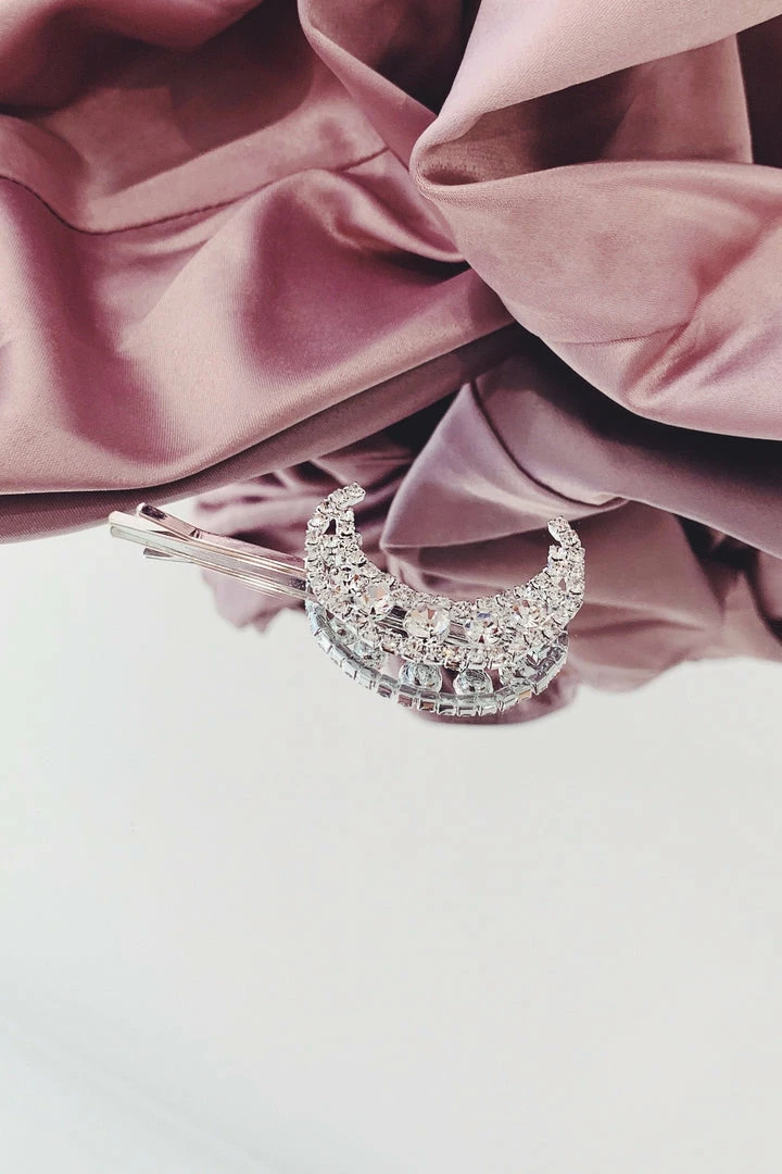 The Silver Moon Hair Pin will be a sweet addition to your next formal gown. It features a unique mood design with diamante detailing. We love pairing this style with our plain black gowns.Â