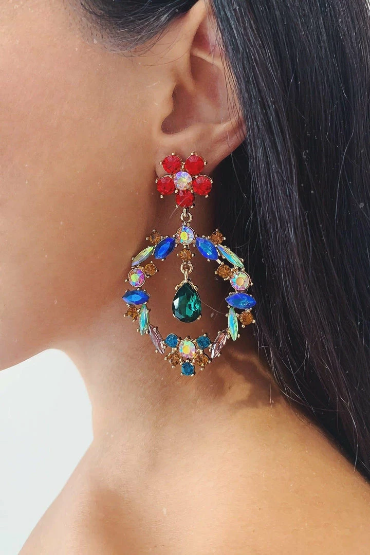 These bright & vibrant crystal earrings add another dimension to your gown with a red crystal flower featuring a multi-coloured drop pendant. The perfect addition to a simple gown.