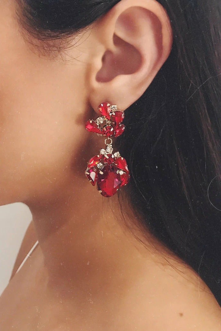 The Paola Red Crystal Drop Earrings will keep you shining all night long. This classic design is intricate and elegant design creates the ultimate statement earring. They feature a clip on back.Â