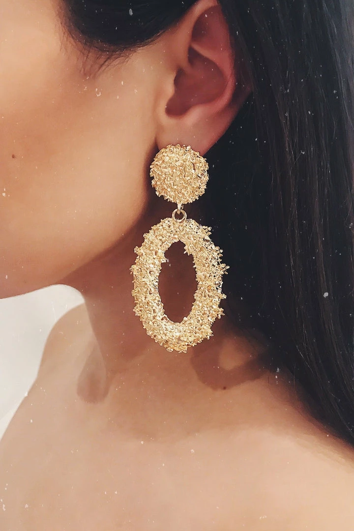 The Tiana Gold Texture Oval Drop Earrings will complete your next outfit. It features a unique oval design with textured gold detailing. This intricate and elegant design creates the ultimate statement earring. They feature a clip on back.Â