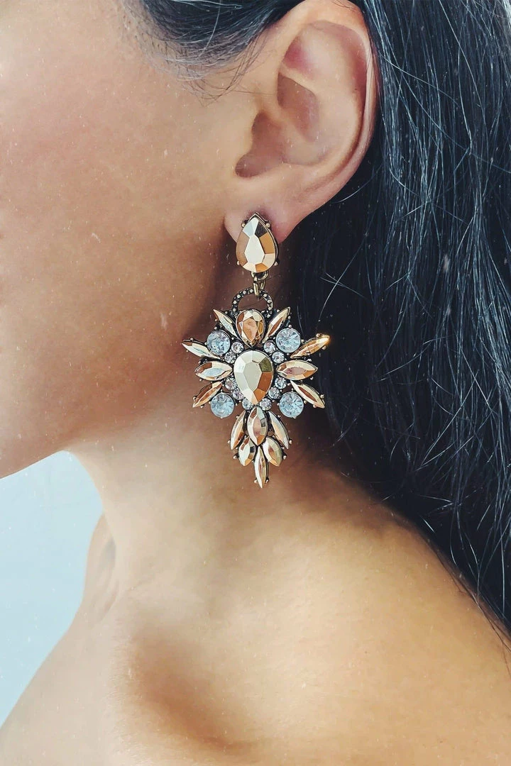 Stylish & striking, the Zahara Statement earrings feature gold hardware embellished with silver and bronze crystals and diamonds. Add eye-catching sparkle to your gown and draw some attention to your face with these gorgeous earrings.