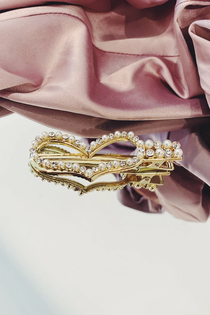 The Gold Diamante Pearl Hair Clip is the perfect finishing touch to your gown. It features a unique heart crystal design with gold detailing. This intricate and elegant design creates the ultimate statement clip. This clip will create the ultimate statement to your look.